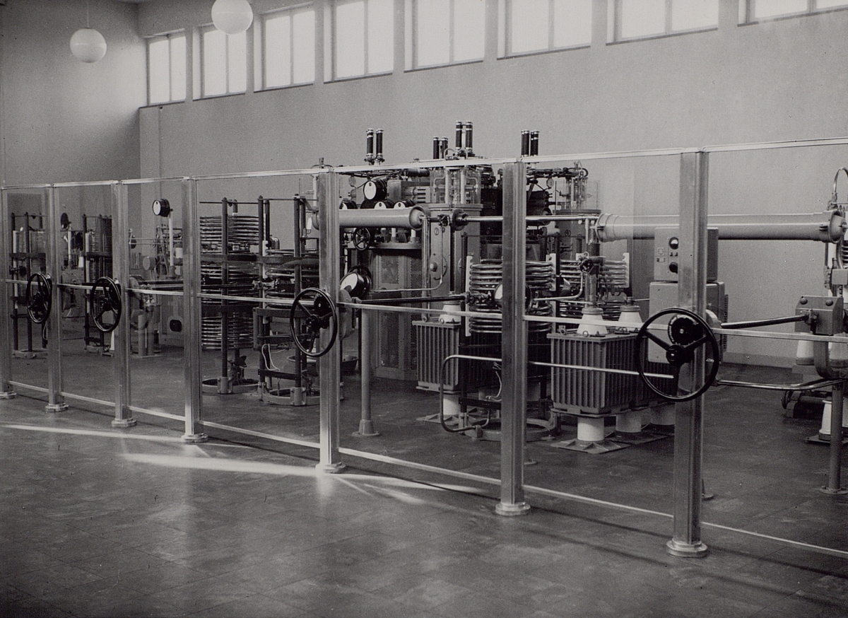 Hörby. Övre sändarsalen med de 3 sista sändarstegen fritt uppställda bakom en skyddande glassvägg.