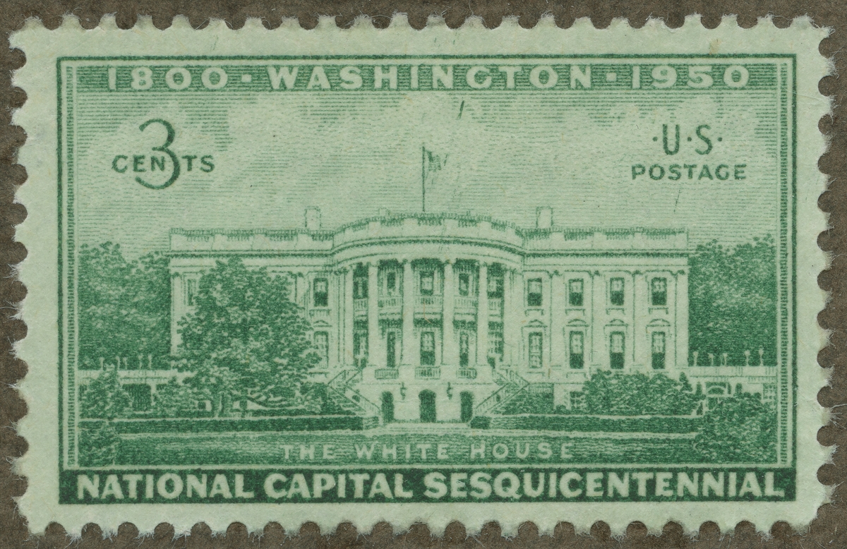 Frimärke från USA, 1950. Motiv av Vita Huset i Washington District of Colombia, presidentens bostad. "150-årsminne".