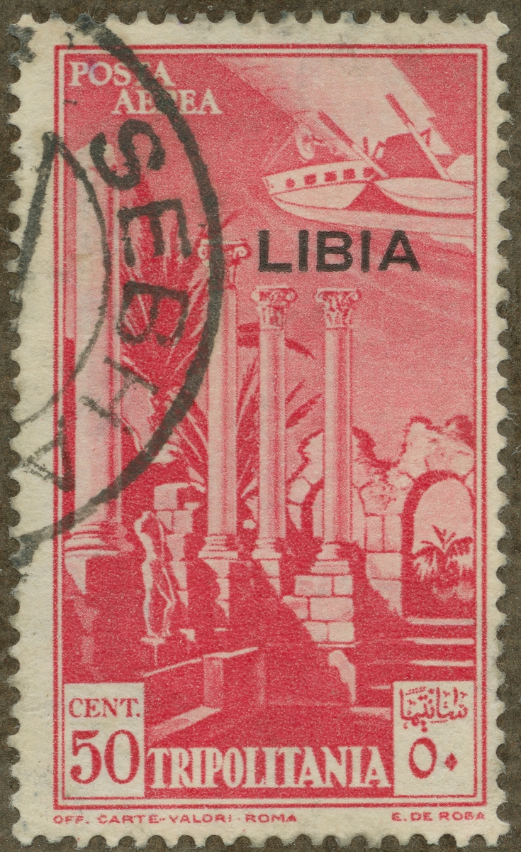 Frimärke från Tripolitania, 1930. Motiv av basilikan Leptis Magna, Libyen. "Luftpost".