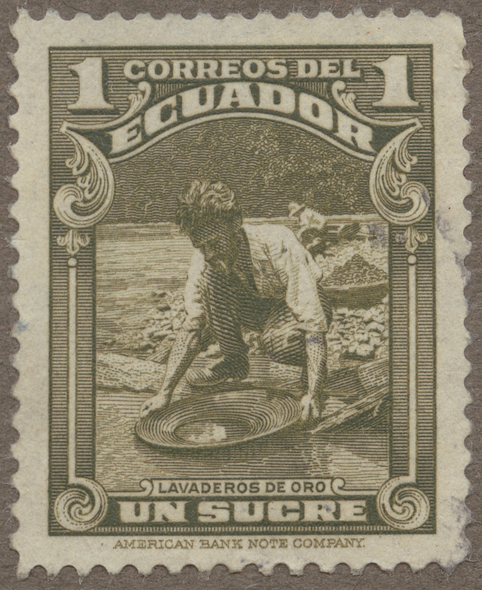 Frimärke från Ecuador, 1937. Motiv av Guldvaskning i Ecuador.