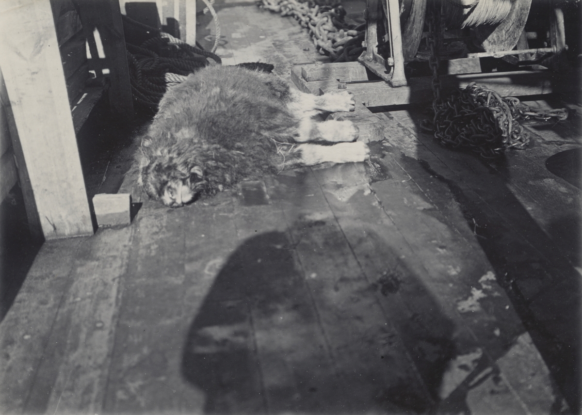 Fotografi från expedition till Grönland. Motiv av dödad långhårig ko som ligger på trägolv.