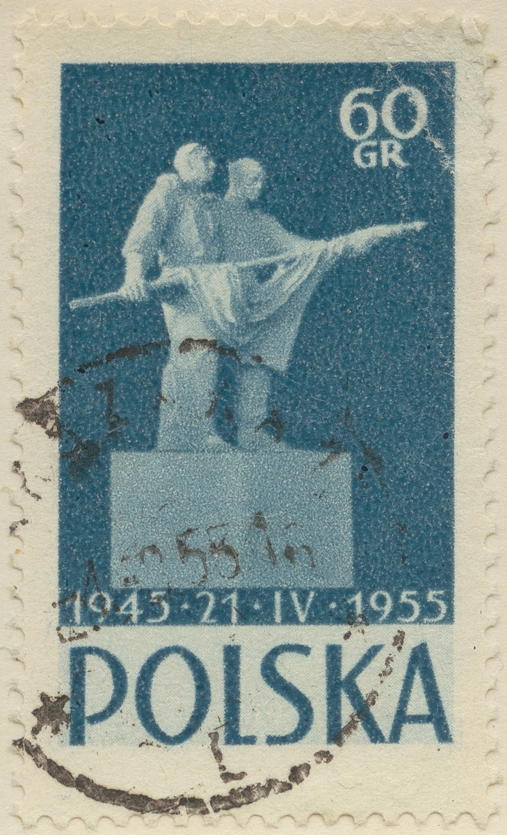 Frimärke från Polen, 1955. Motiv av Fanbärare: monument i Warszawa över polsk-sovjetiskt vänskapsavtal av Alina Szapocznikow(a) som 10-årsminne 1945-1955. "-Serie: Warszawas monument-"