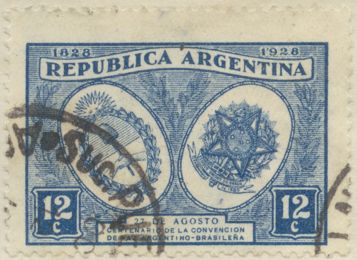 Frimärke från Argentina, 1928. Motiv av (t.v.:) Argentinas Vapen (t.h.): Brasiliens Vapen 100-årsminnet av fredsfördraget d. 27 augusti 1828 emellan "Empire of Brazil" och "United Provinces of the Rio de la Plata"