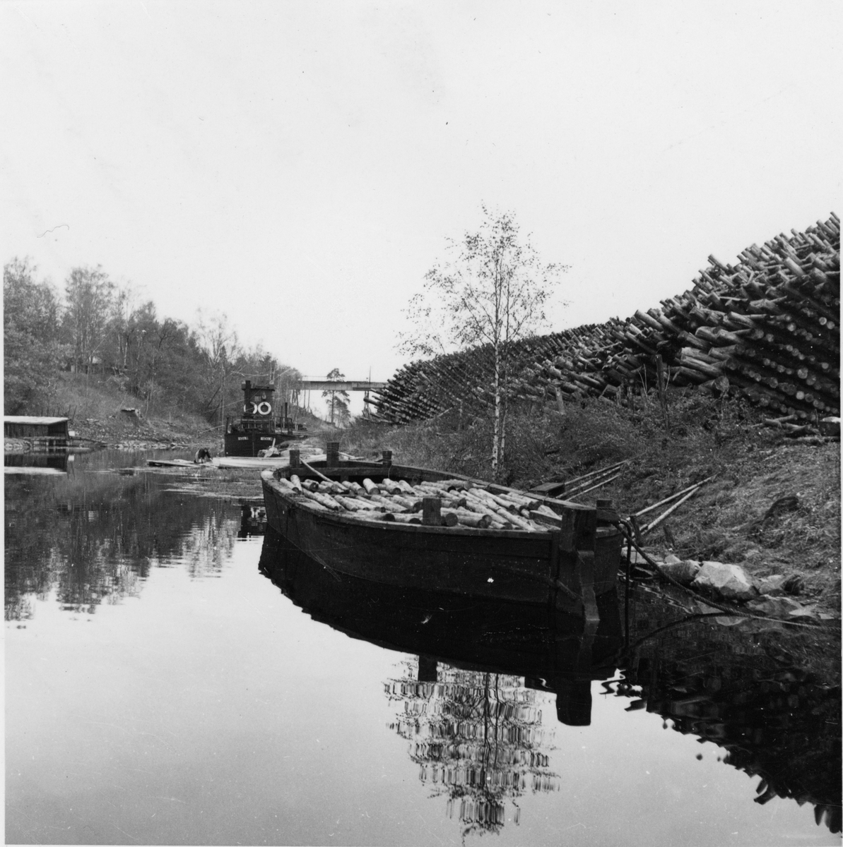 Sulfatfabrik. Gustafsfors Fabrikers Aktiebolag. Kanalen ovanför slussen. En vedpråm och en vedfärja. Järnvägsbron i bakgrunden och till höger vedupplag.