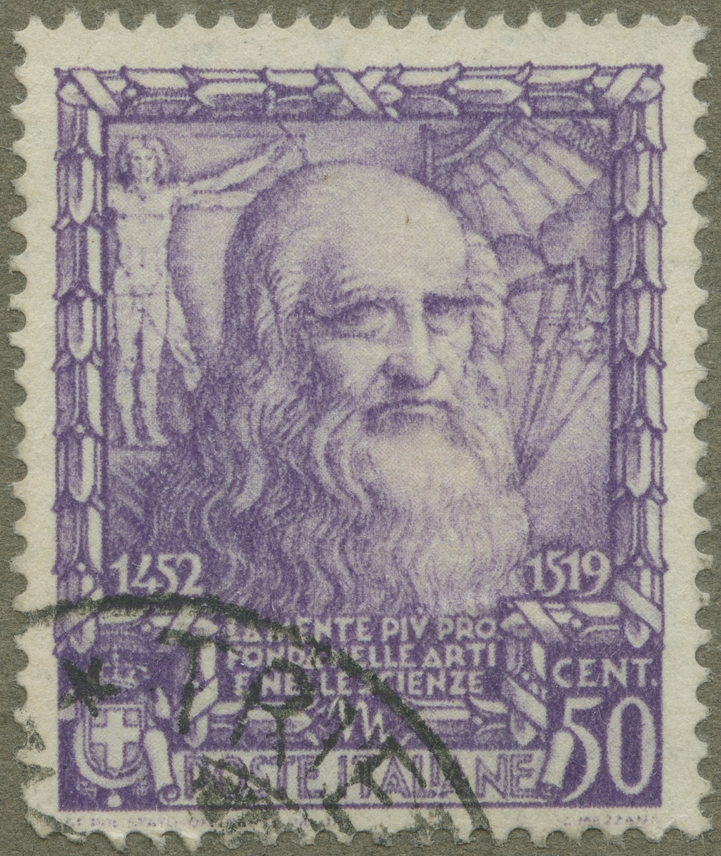 Frimärke från Italien, 1938. Motiv av Leonardo da Vinci: 1452-1519. Italiensk tekniker och konstnär. Har genom sina skisser och anteckningar givit eftervärlden en god bild av sina egna och samtidens mekaniska konstruktioner.