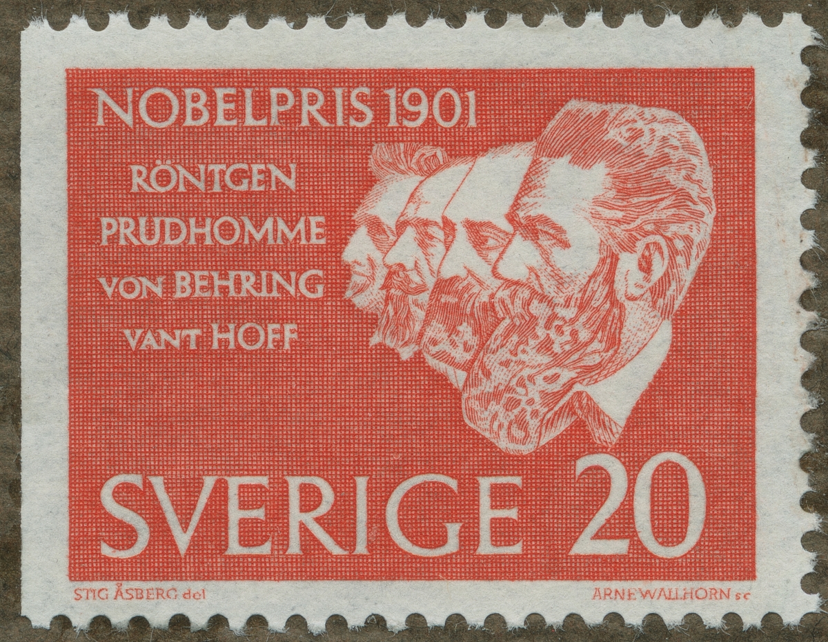 Frimärke från Sverige, 1961. Motiv av (nr. 4 fr. vänster): Wilhelm Conrad Röntgen: 1845-1923. Tysk fysiker. Upptäckte 1895 de strålar som utgå från kroppar som träffas av katodstrålar. De kallades av honom X-strålar (=röntgenstrålar). Gav upphov till röntgenfotografering samt bekämpande av kräftsjukdomar med röntgenstrålar. Första Nobelpris i fysik: 1901. -60-årsminnet av första Nobelprisutdelningen 1901-