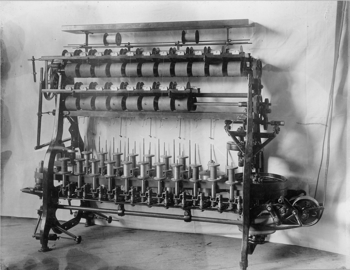 Tvinnmaskin för konstsilke från R.W. Strehlenerts Silkesfabrik, Västergötland. Omkring 1901.