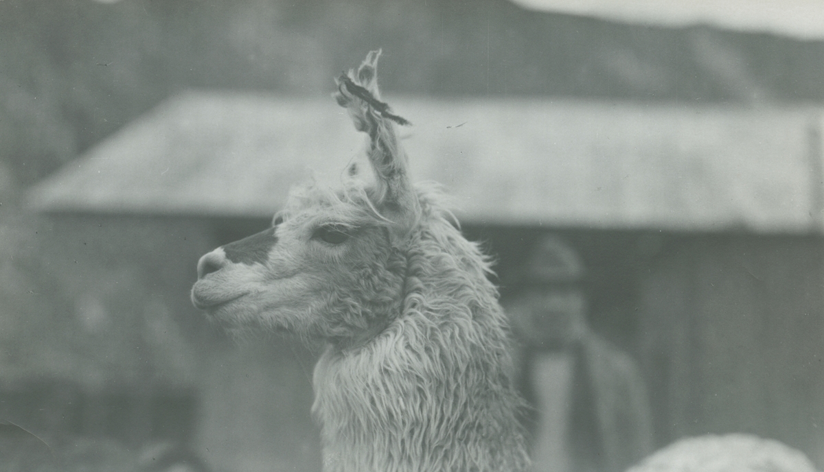 Fotografi från expedition till Peru 1920. Närbild av lama.