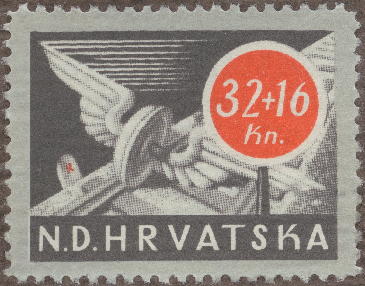 Frimärken ur Gösta Bodmans filatelistiska motivsamling, påbörjad 1950. Frimärke från Kroatien, 1944. Motiv av Järnvägssymboler "Serie för P.T.T. - Post, Telegraf, Telefon -"