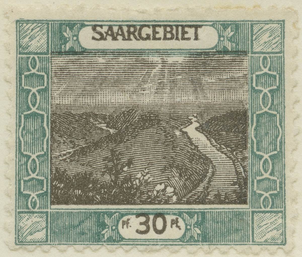 Frimärke ur Gösta Bodmans filatelistiska motivsamling, påbörjad 1950. Frimärke från Saar, 1921. Motiv av Floden Saar vid Mettlach