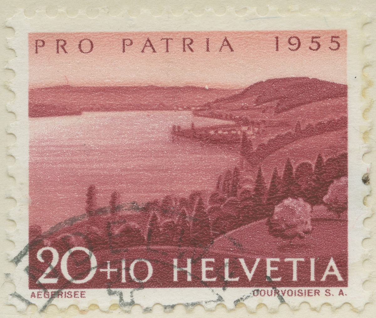 Frimärke ur Gösta Bodmans filatelistiska motivsamling, påbörjad 1950. Frimärke från Schweiz, 1955. Motiv av Aegeri Sjön "Pro Patria"