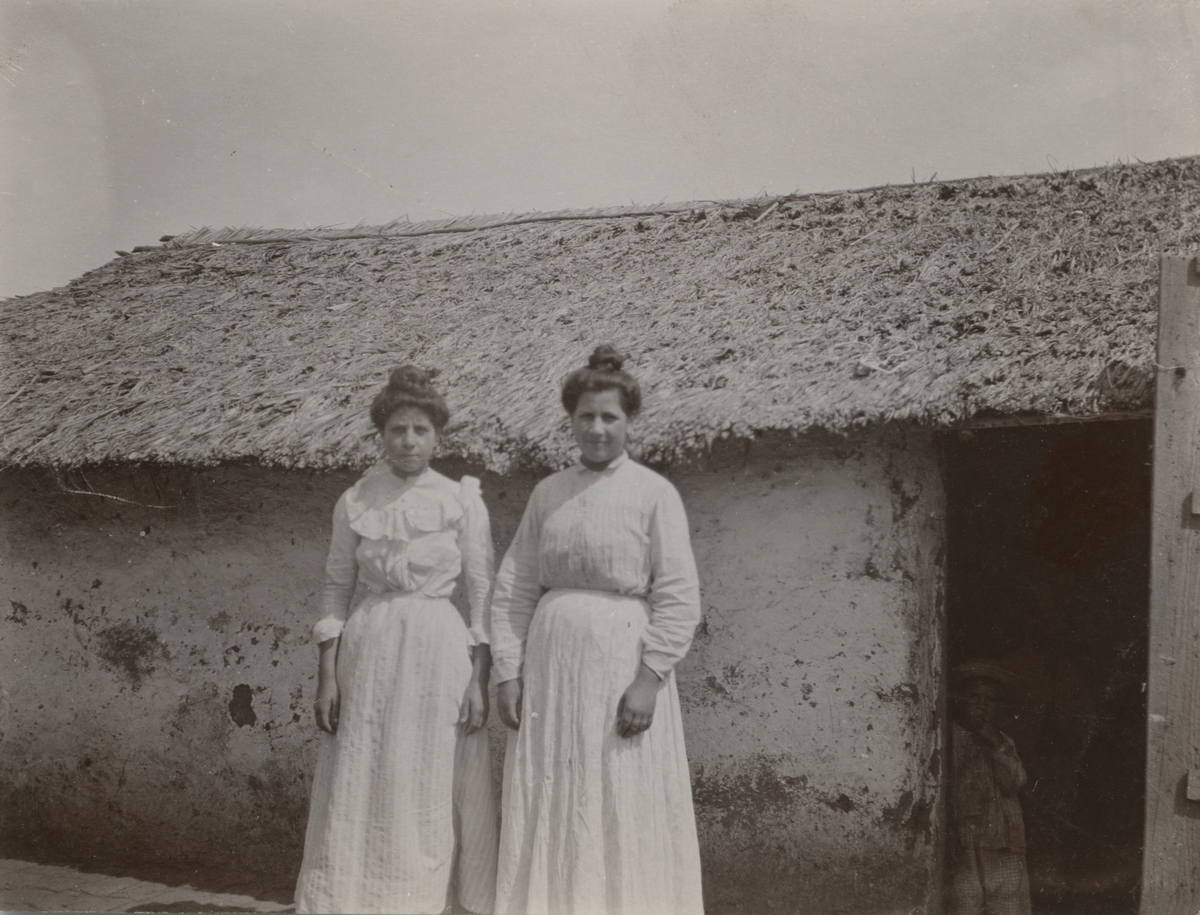 Fotografi från expedition till Grönland. Motiv av två kvinnor i vita klänningar som står utanför ett litet hus.