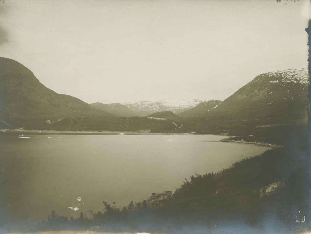 Fotografi från expedition till Grönland. Vy över hav och snötäckta berg.