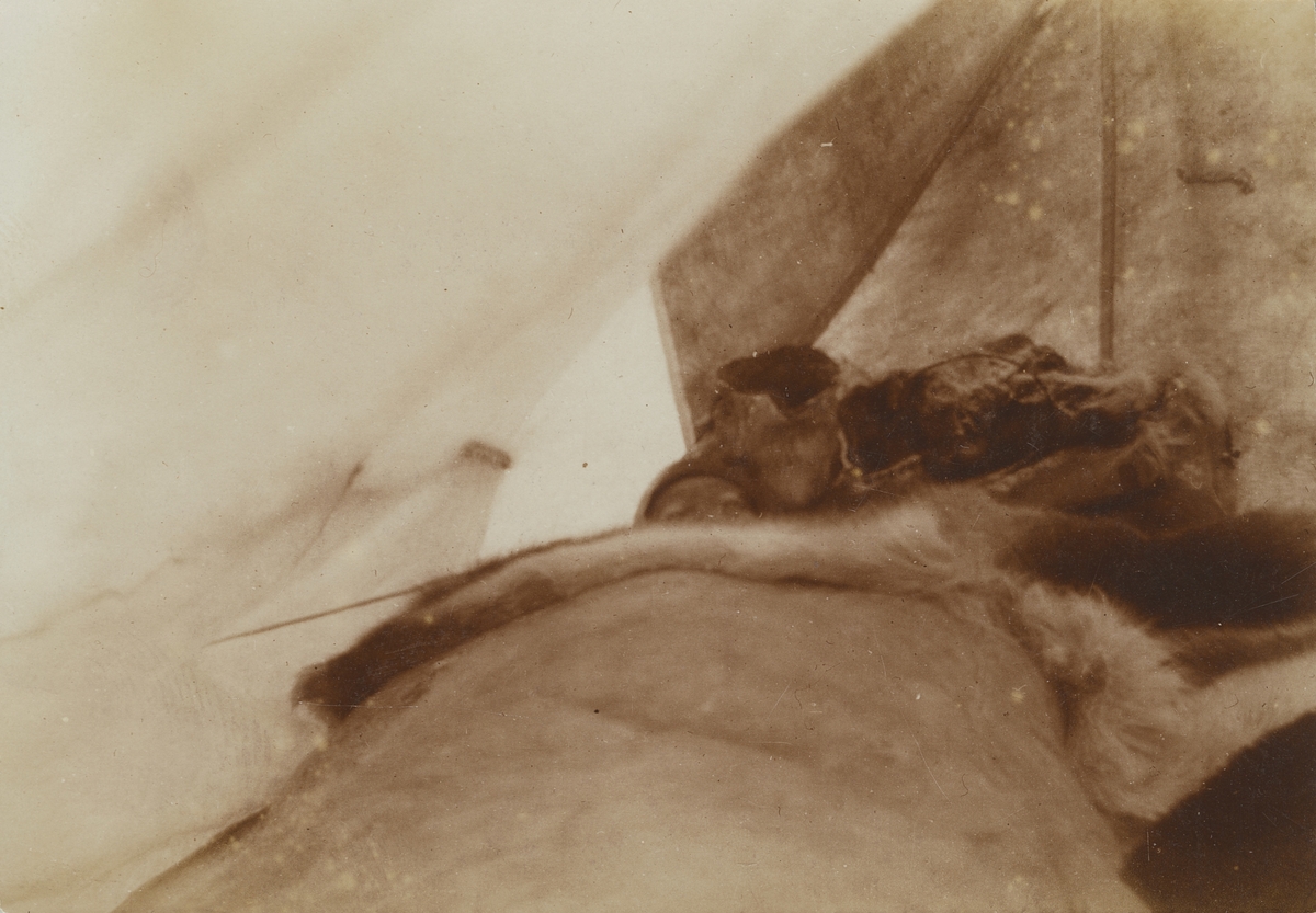 Fotografi från första svenska Antarktisexpeditionen 1901-1904. Motiv av person som ligger nedbäddad i ett tält.