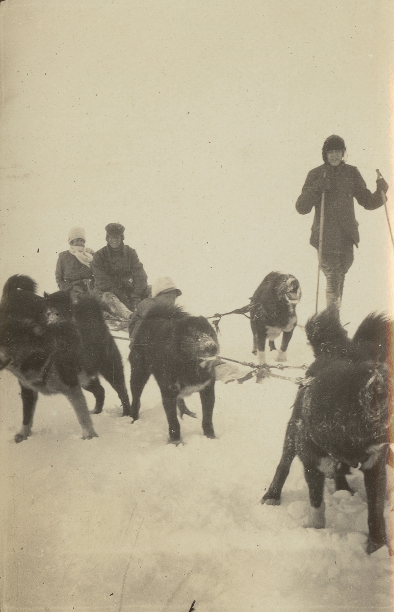 Fotografi från expedition till Spetsbergen. Motiv av hundspann som drar två personer. En annan person åker skidor bredvid.