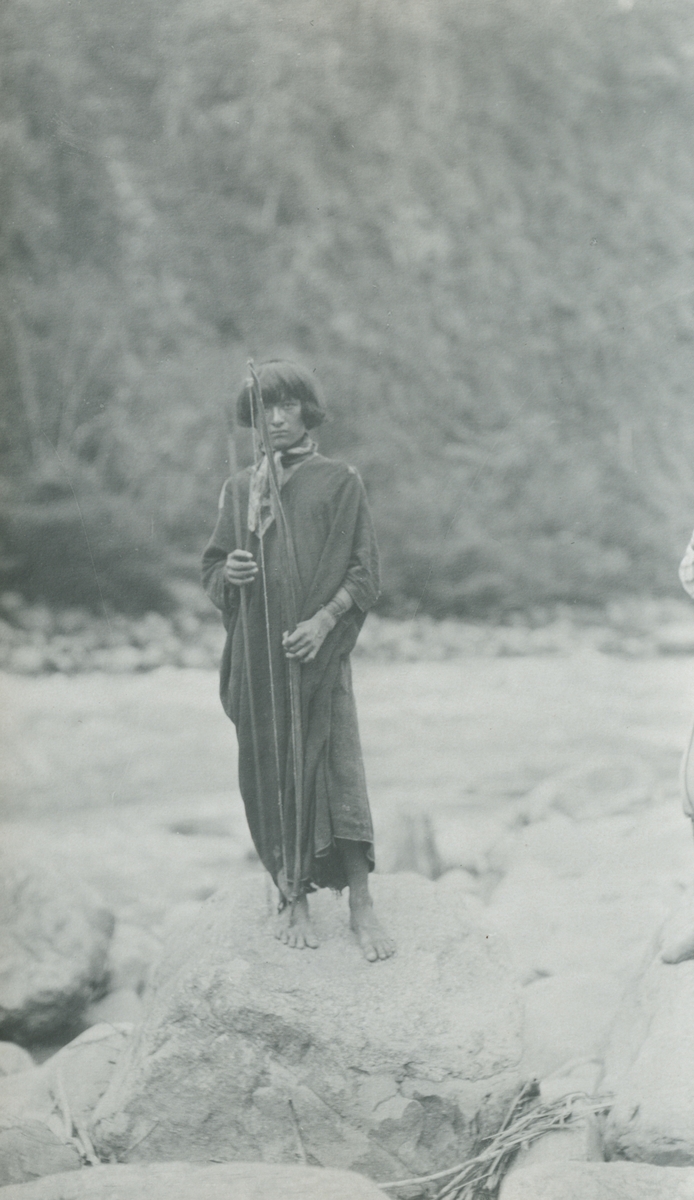 Fotografi från expedition till Peru 1920. Motiv av man med pil och båge stående på stenblock i djungeln.