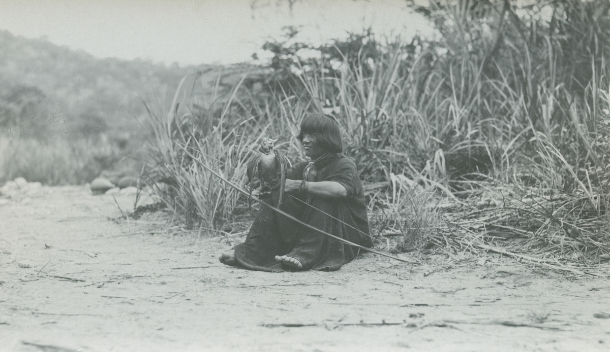 Fotografi från expedition till Peru 1920. Motiv av man med pilbåge som sitter på marken i djungeln och håller i fågel.