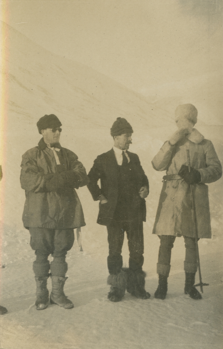 Fotografi från expedition till Spetsbergen. Motiv av tre expeditionsdeltagare som står uppställda bredvid varandra i ett vinterlandskap.