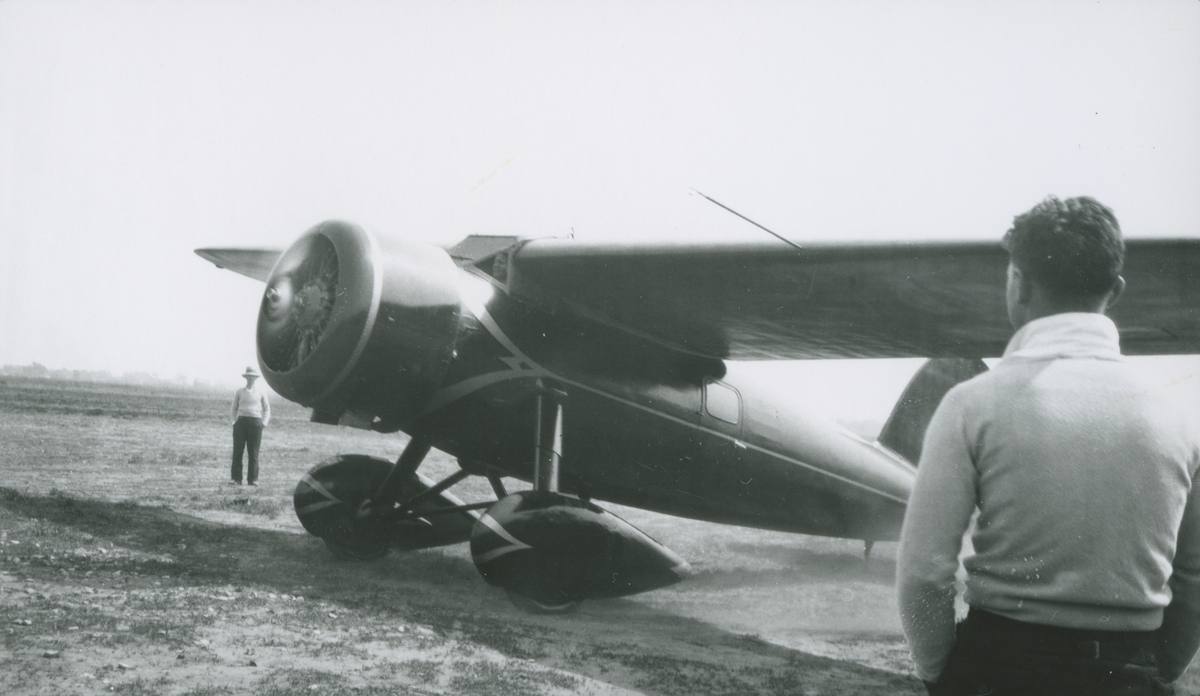Fotografi från låda märkt Bernt Balchen. Balchen var norsk-amerikansk flygare, polarforskare och militär. Motiv av två män som står och tittar på ett flygplan.