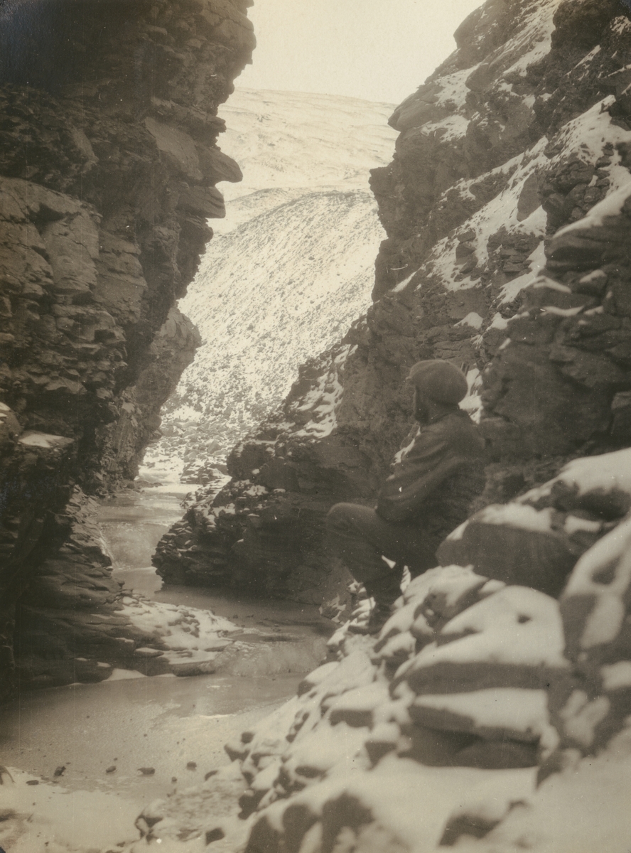 Fotografi från expedition till Sveagruvan. Motiv av man som sitter i en snötäckt bergsskreva.