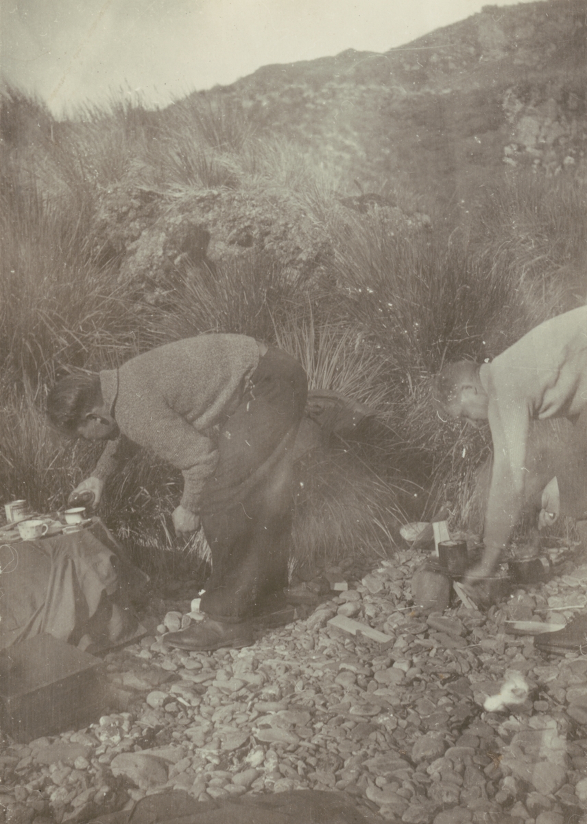 Bild från expedition i Antarktisområdet. Motiv av två män som förbereder sig inför en fisketur.