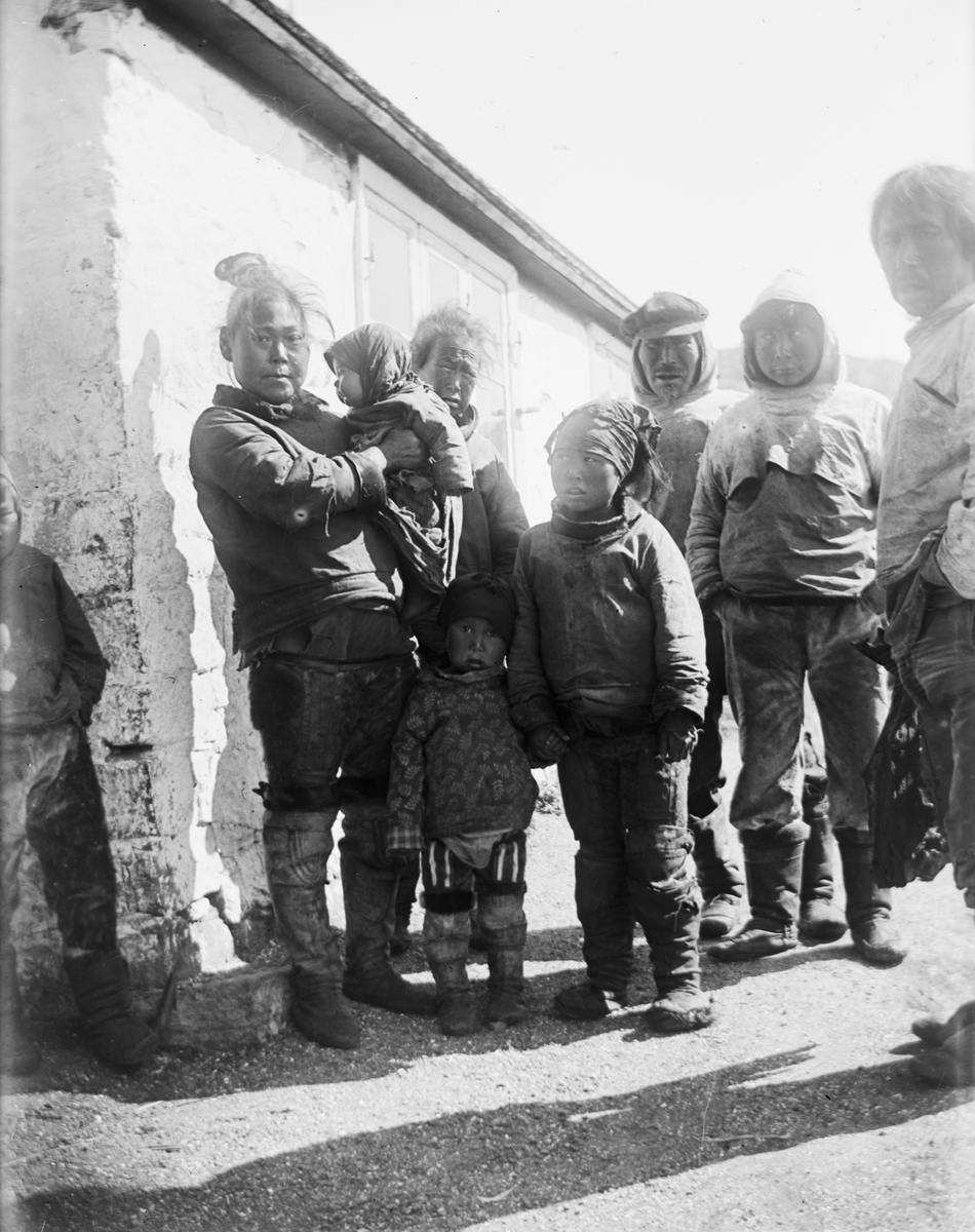 Fotografi från Grönland. Motiv av män, kvinnor och barn framför hus.