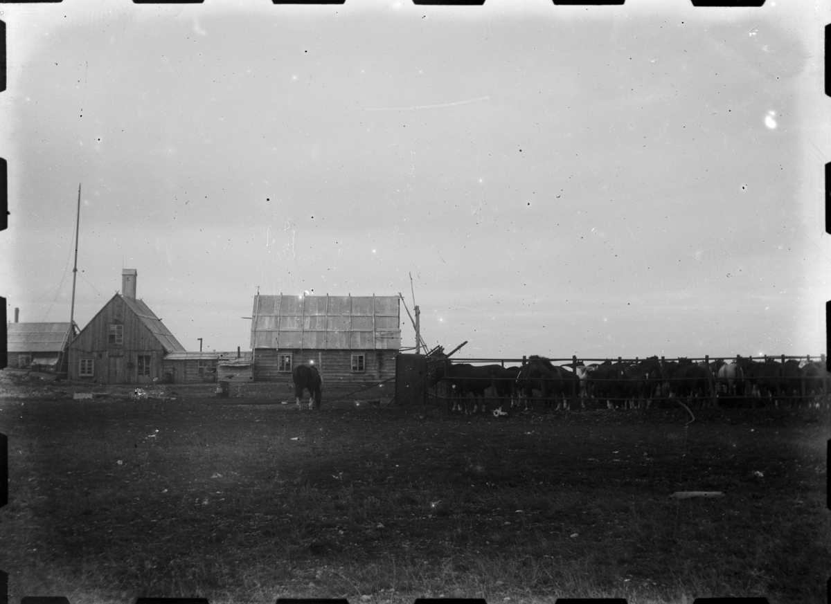 Fotografi från Eldslandet. Motiv av hästar vid trähus.