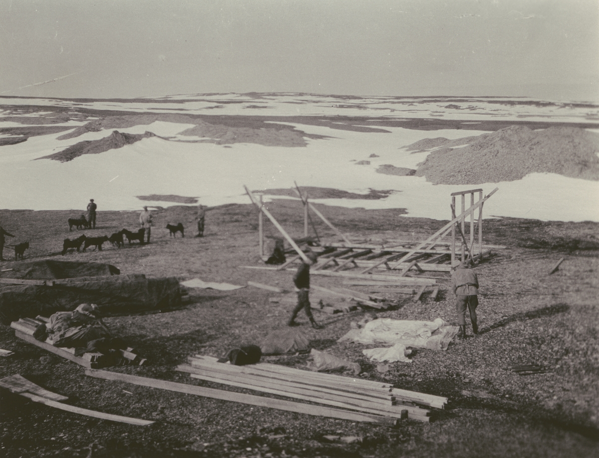 Fotografi från Ahlmannexpeditionen 1931. Motiv av män som bygger hus i öde landskap.