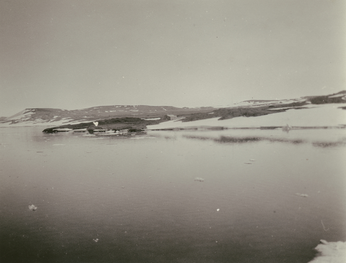 Fotografi från Ahlmannexpeditionen 1931. Vy över hav och snötäckta berg.