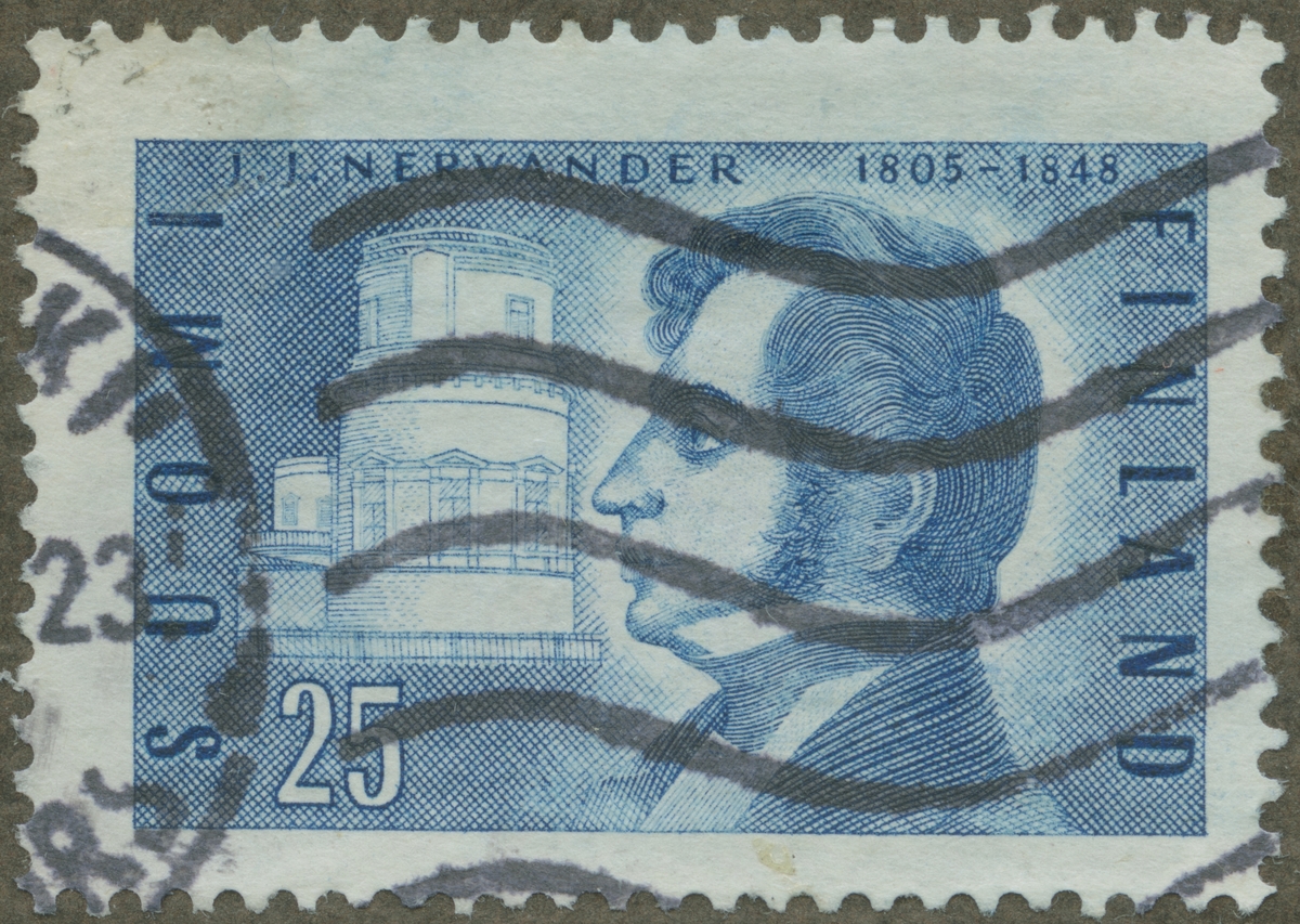 Frimärke ur Gösta Bodmans filatelistiska motivsamling, påbörjad 1950. Frimärke från Finland, 1955. Motiv av Finlands astronomiska Observatorium " Astronomen J. J. Nervander 1805- 1848."