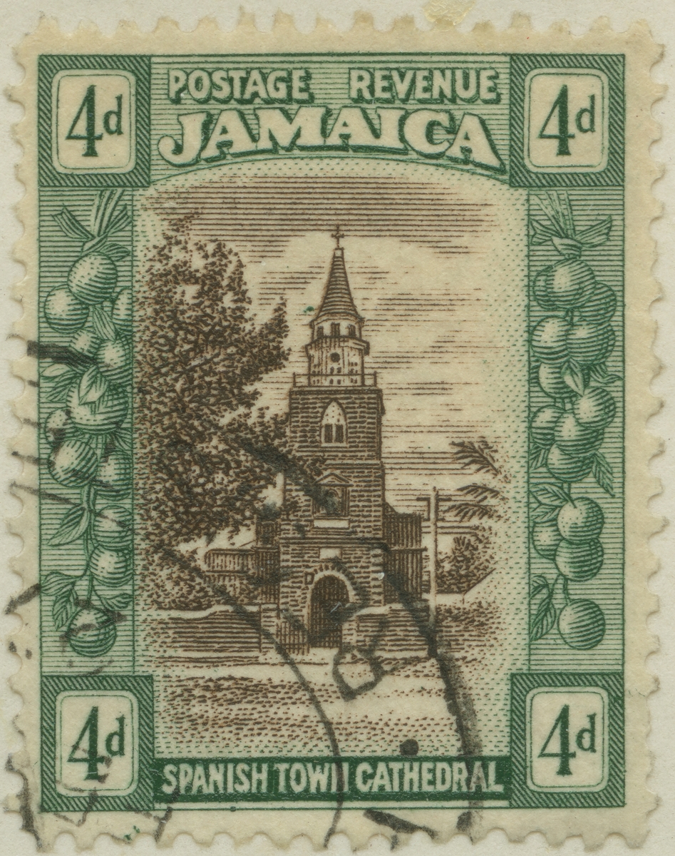 Frimärke från Jamaica, 1921. Motiv av kyrkan i staden Spanish Town.