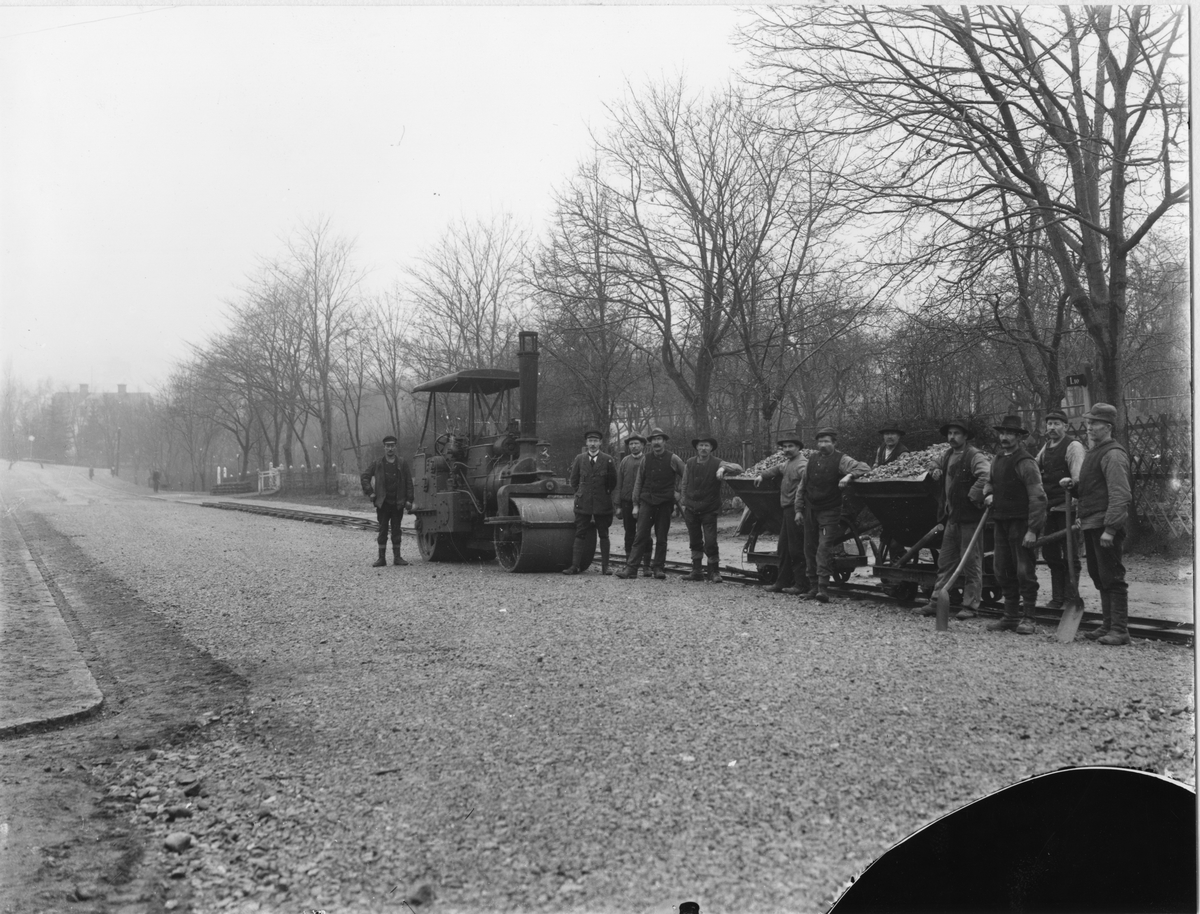 Vägarbetare, okänd plats. Ångvälten tillverkad av Aveling & Porter, Storbritannien. Se firmans hästsymbol "invicta" frampå.