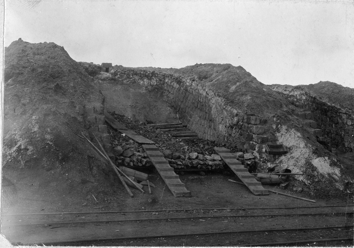 Falu koppargruva. Rostbås, vilka användes innan ugnarna byggdes. Bottenlagret av träkol och ved.