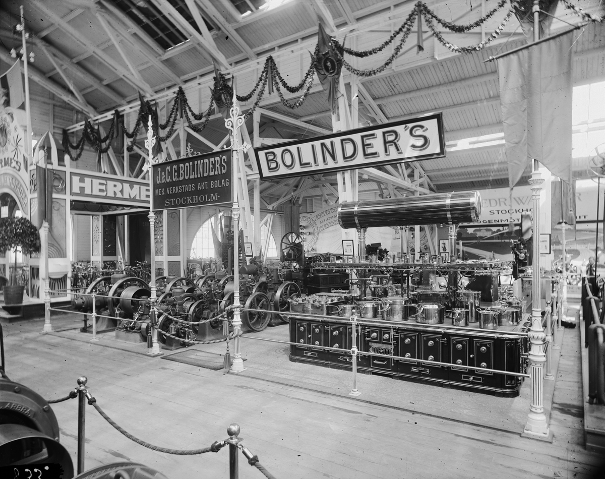 Utställningsinteriör, restaurangkök- och motorutrustning. Okänd plats.