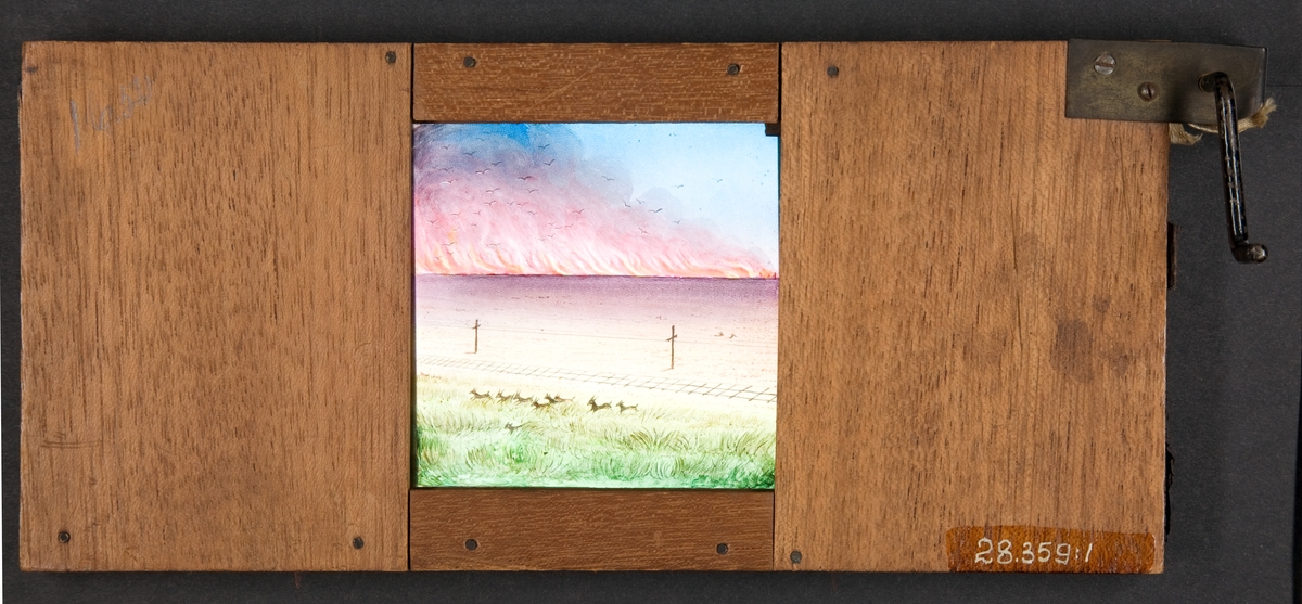 Präriebrand med flyende fåglar, hjortar och bisonhjord, jagande indian till häst, cowboy på buffel, ångtåg från 1850-talet