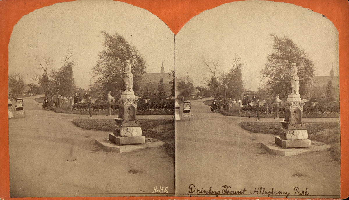 Stereobild av människor på promenad i park. Dryckesfontän. Okänd plats.