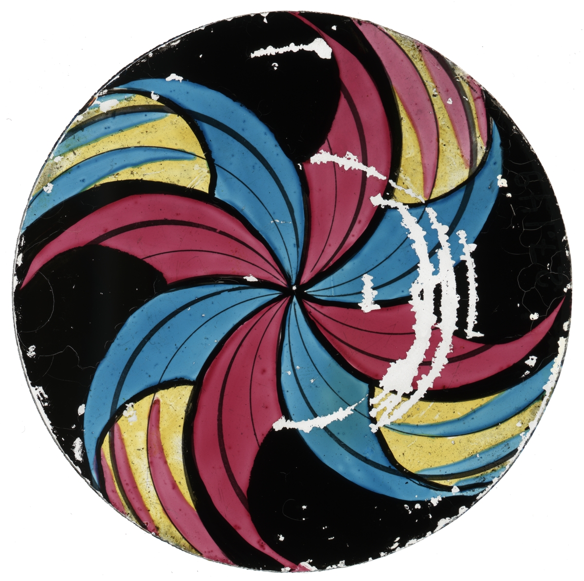 Colorerad bild på glas för Skioptikon/Laterna magica.