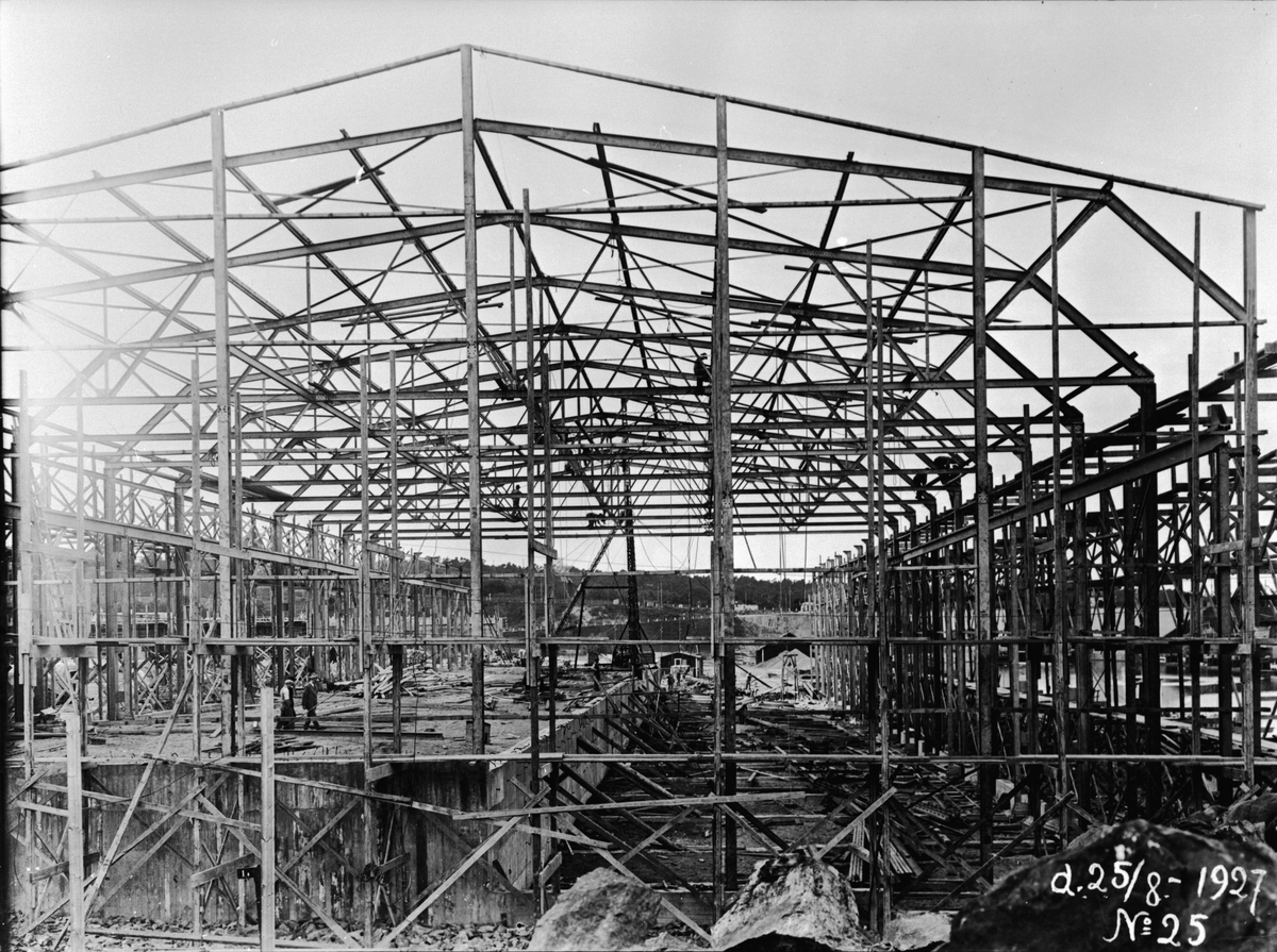 Titel: Byggherre: Bygnadaktiebolaget Contractor, Stockholm. General Motors Nordiska AB:s första fabriksbyggnad i Sverige. Arbetsbild. Hammarbyhamnen 1927.