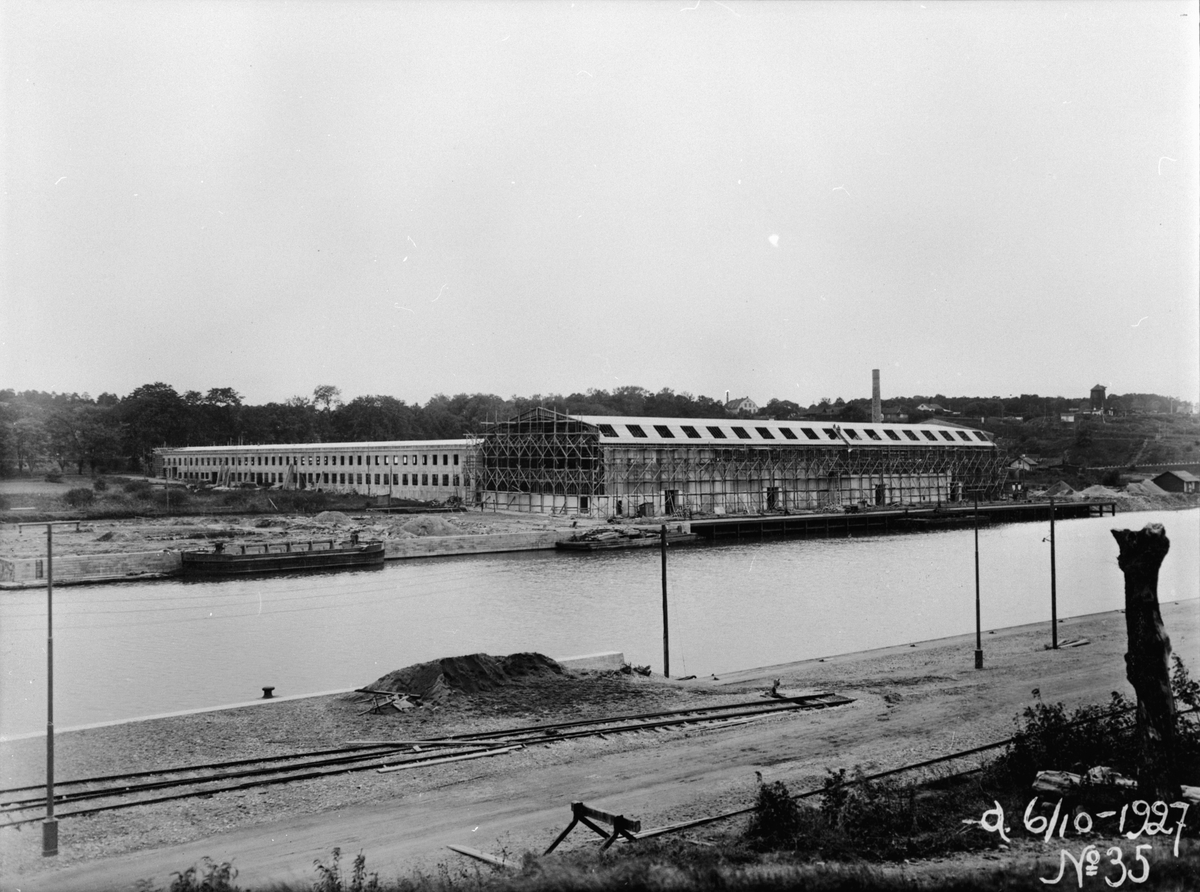 Titel: Byggherre: Bygnadaktiebolaget Contractor, Stockholm. General Motors Nordiska AB:s första fabriksbyggnad i Sverige. Arbetsbild. Hammarbyhamnen 1927.