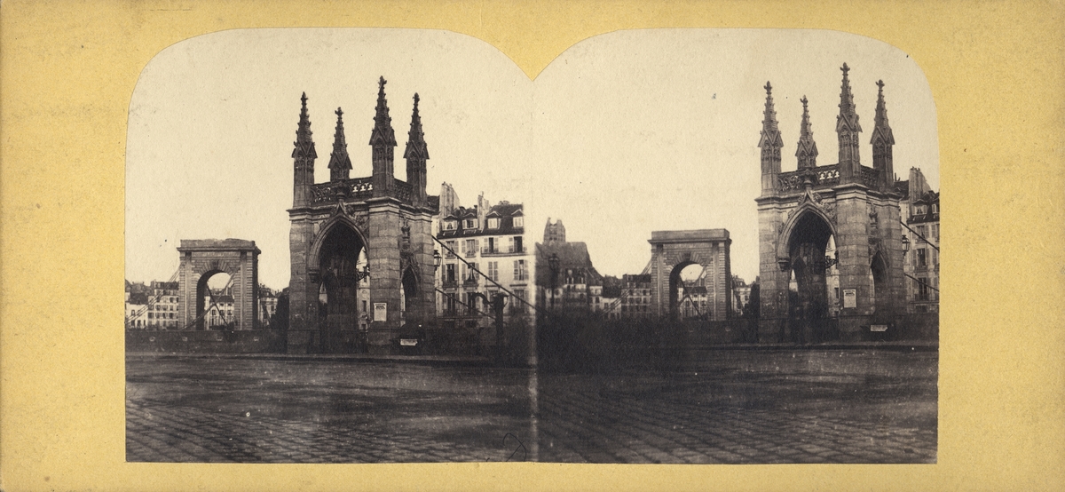 Stereobild av port till hängbro.