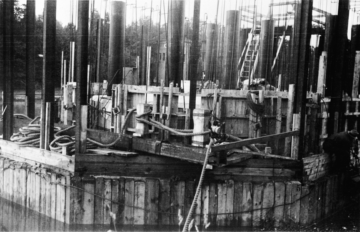 Byggherre: Byggnadsaktiebolaget Contractor, Stockholm. Götaälvsbron. Kassun färdiggjuten och försedd med provisoriska väggar av trä för bogsering.