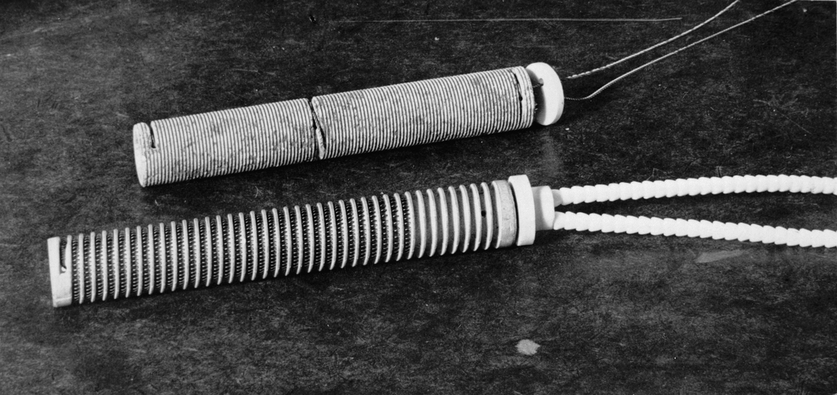Elektriska värmepatroner med yttermanteln borttagen. Den övre av gamla typen med enkelspiral. Den undre av nya typen med dubbelspiral. Den senare införd under 1940.
