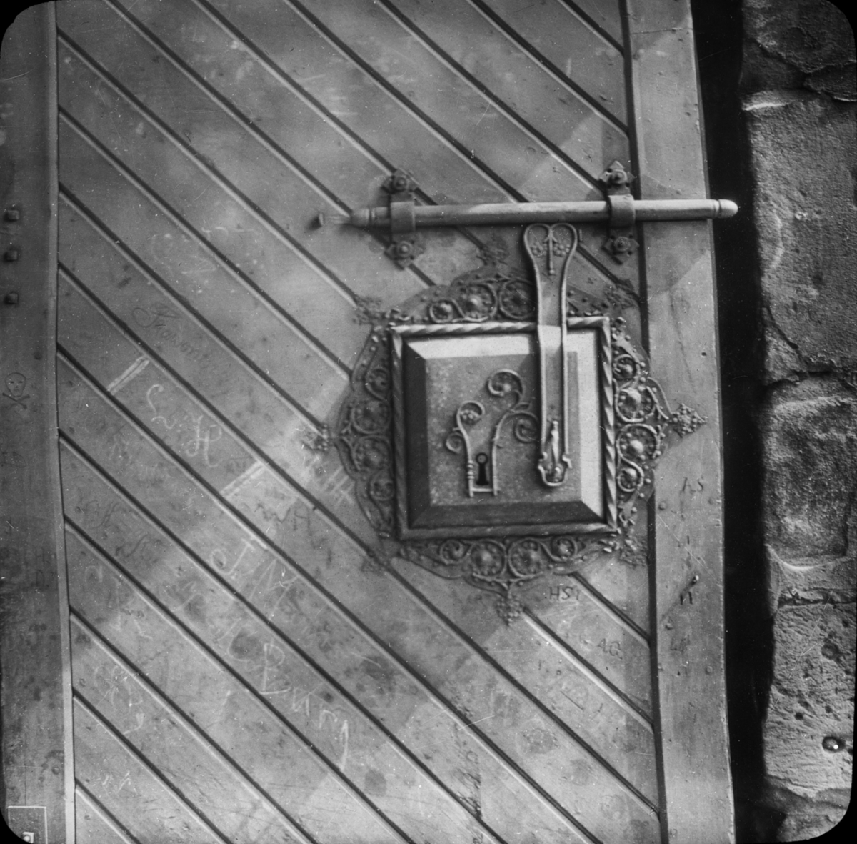 Skioptikonbild med motiv av äldre lås på dörr till Toplerhaus i Nürnberg.
