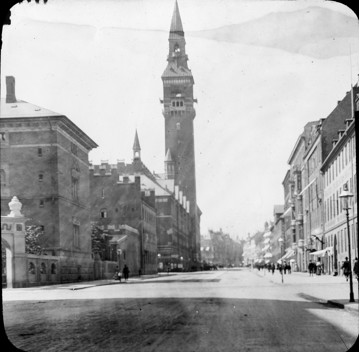 Skioptikonbild med motiv från köpenhamn med Rådhuset och Rådhusplatsen.