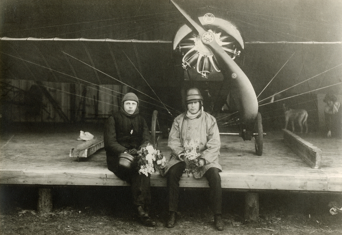 Enoch Thulin och löjtnant Otto Ask omedelbart efter de 12-28 april 1914 fullbordade flygningen mellan Paris- Landskrona, med det av Thulin i Frankrike inköpta Morane-Saulnier-monoplanet, (med Le Rhone-motor på 80 hk).