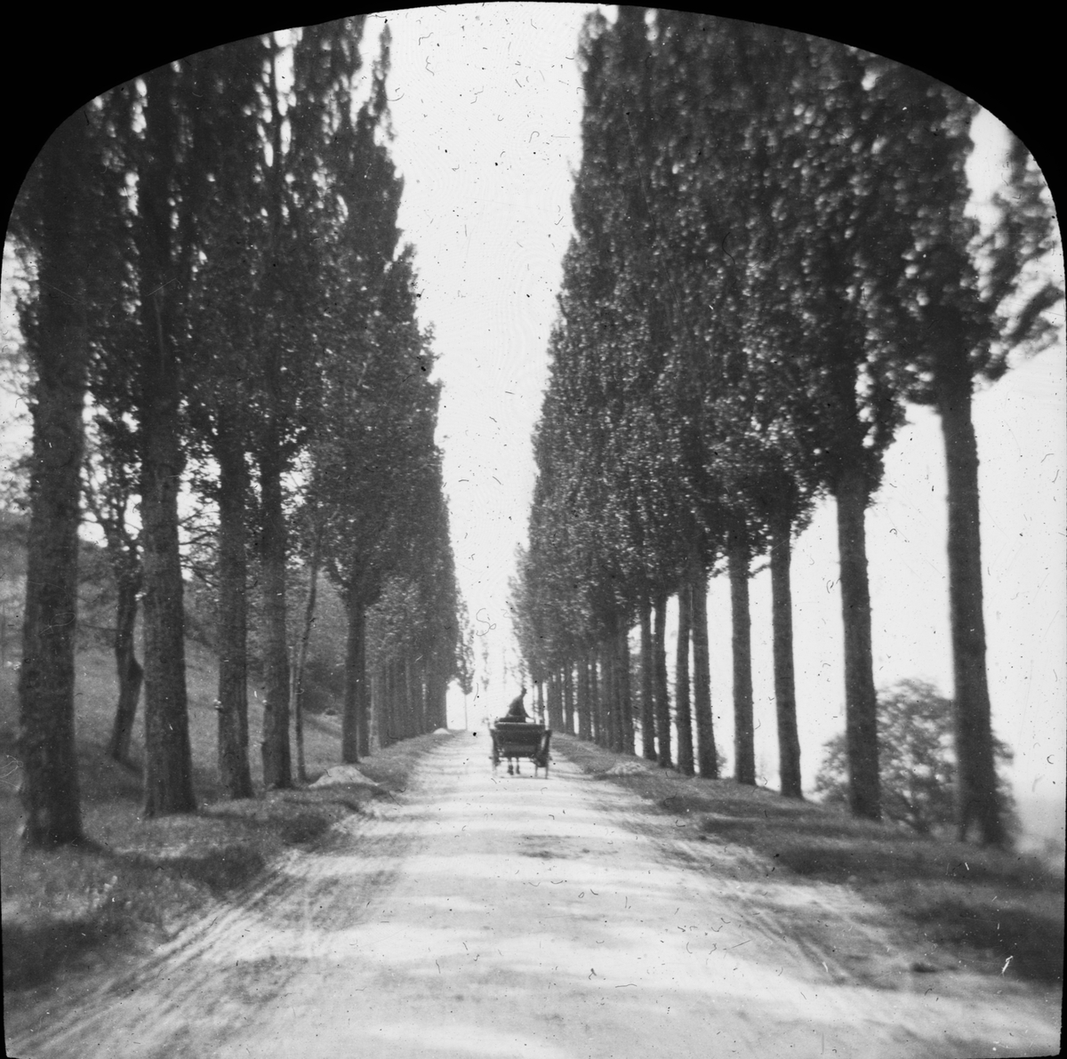 Skioptikonbild med motiv av häst och vagn i allé i Vichy.