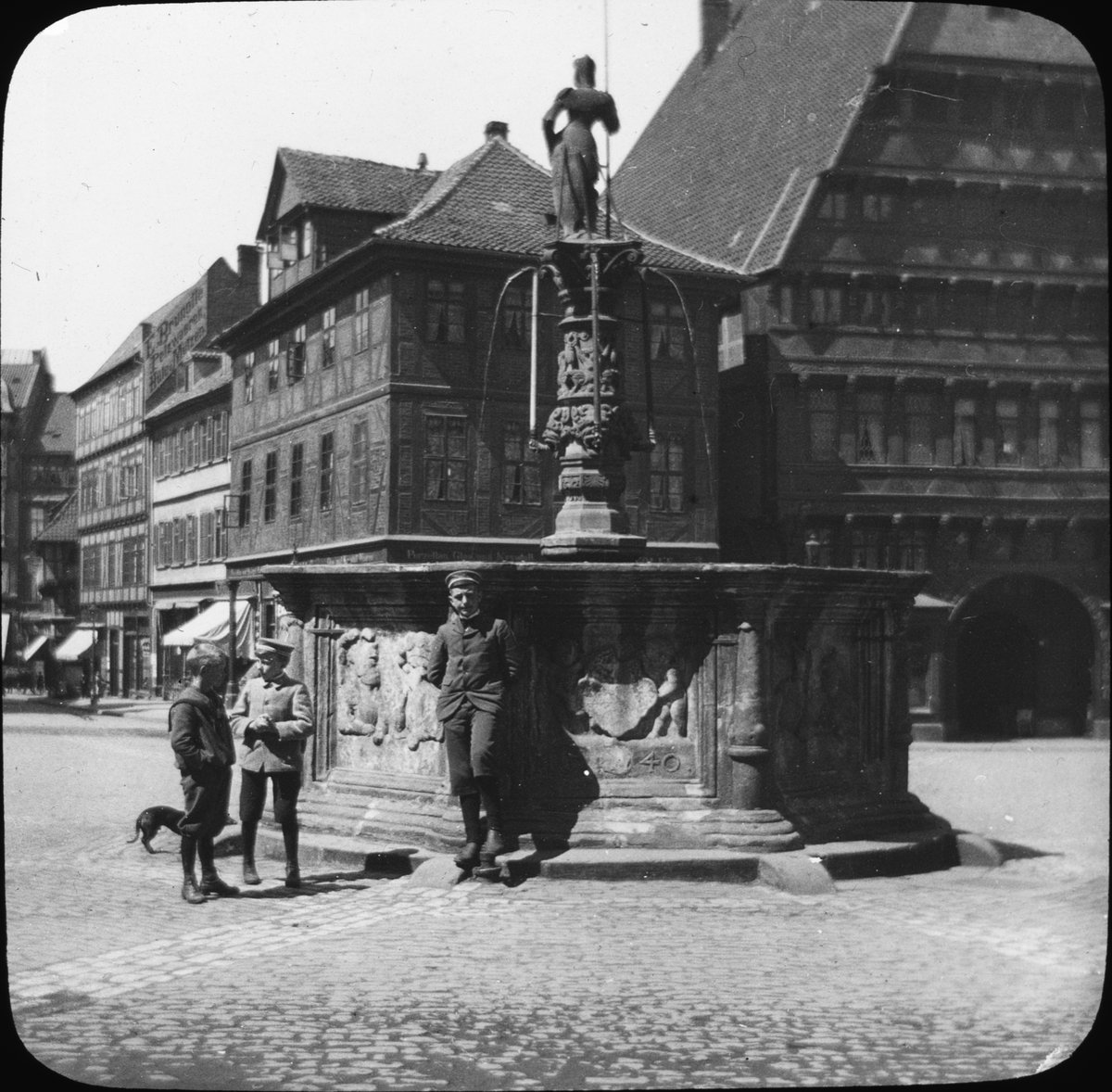 Skioptikonbild med motiv av pojkar vid Rolandsbrunnen, Hildesheim.