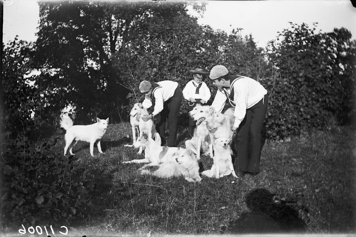 Drottning Victorias bilder. Prinsarna lekande med hundar.