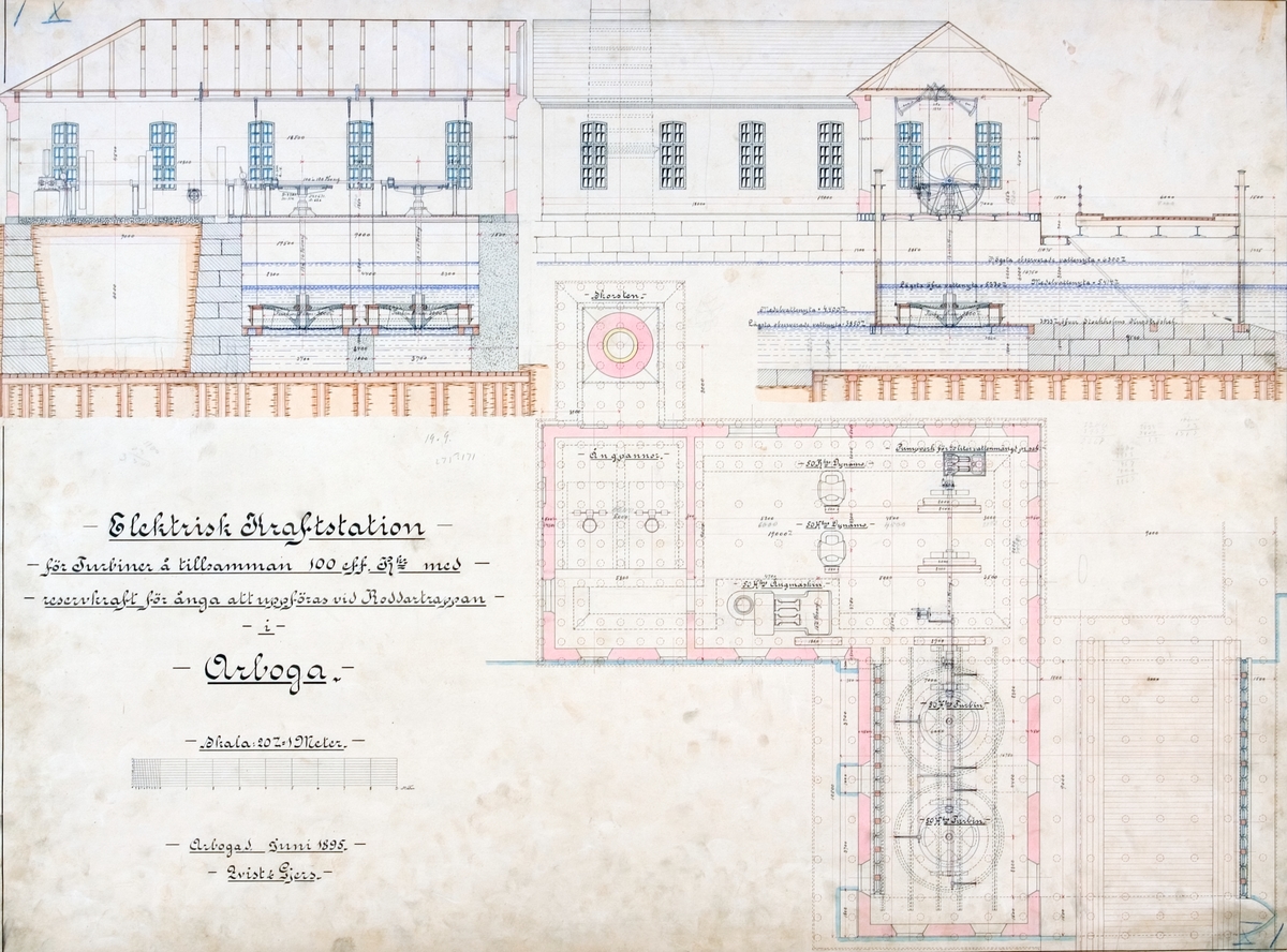 Ritning. Elektrisk kraftstation för turbiner och tillsammans med reservkraft för ånga att uppföras vid Roddartrappan i Arboga.