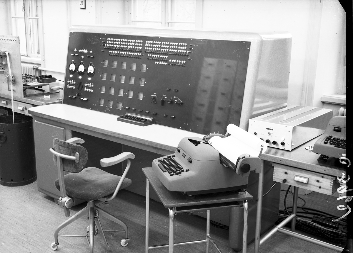Dokumentation av byggandet av matematikmaskinen BESK på Drottninggatan i Stockholm. Manöverbord från tidigt skede innan bildrör monterats.